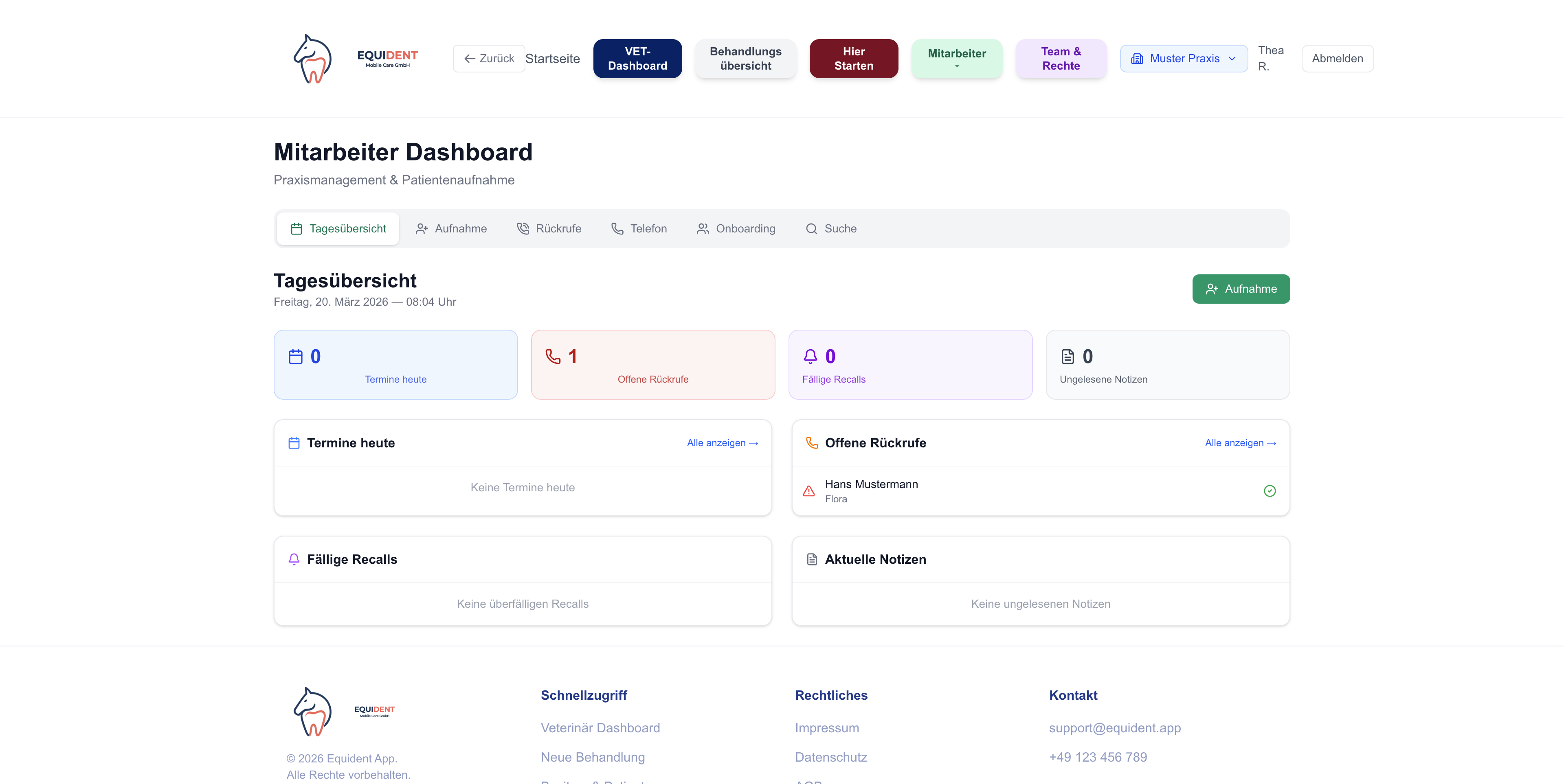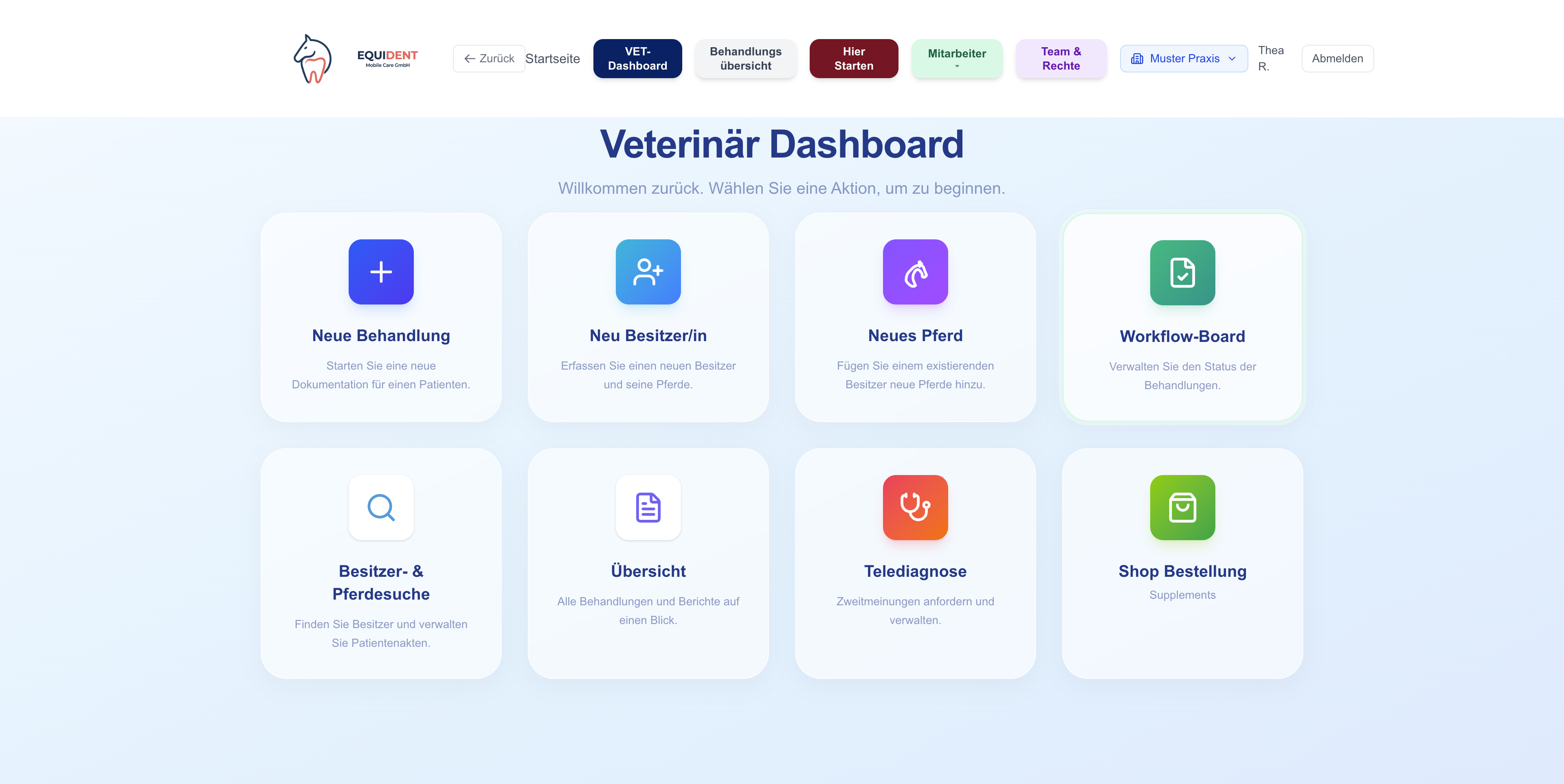 Mit einer intuitiven Benutzeroberfläche und nahtlosen digitalen Workflows vereinfacht Equident die tägliche Arbeit von Pferdezahnärzten grundlegend — von der Befunderfassung bis zur professionellen Dokumentation. Behandlungen werden 60% schneller dokumentiert, die Fehlerquote sinkt signifikant, und Pferdebesitzer erhalten transparente, verständliche Berichte. Die digitale Transformation der equinen Zahnmedizin beginnt hier.