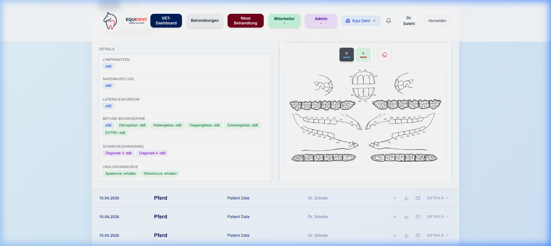 Equident digitalisiert den gesamten Workflow von der Befundaufnahme über das interaktive Dental-Chart bis zur automatischen PDF-Erstellung und Abrechnung. Die App wurde speziell für den Stalleinsatz optimiert — mit Touch-First-Design, offline-fähiger Architektur und einer Oberfläche, die sich intuitiv bedienen lässt. Jede Behandlung wird revisionssicher dokumentiert und als professioneller Bericht direkt an Besitzer versendet.